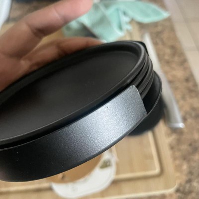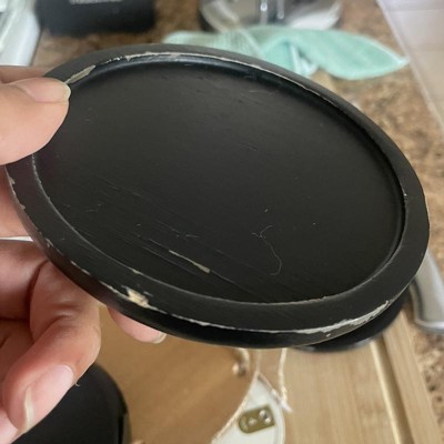 A: The coasters have a classic round shape with a rim detail in a solid black finish.