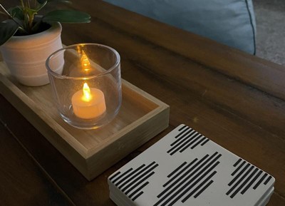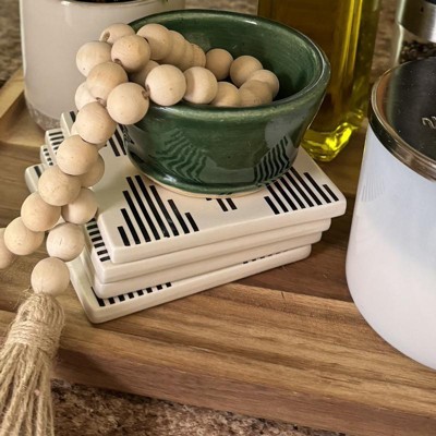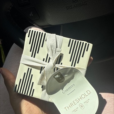 Protect your table from messy spills and drink marks with this 4-Pack Stoneware Modern Diamond Coasters from Threshold™. This set of four stoneware coasters brings functional style to your entertainment table. Each of the pieces features a modern square shape with a black diamond pattern on a cream backdrop for a contrasting, chic look. The thickness of the coasters protects your tabletop from unnecessary scratches, stains or spills from glasses and cups. Plus, they can be hand washed for easy care.