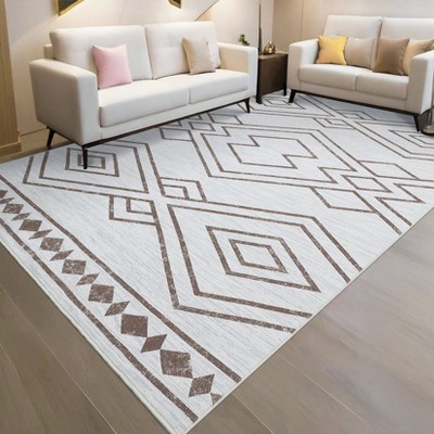 4x6FT Modern Washable Area Rug for Living Room, Bordered Print Floor Rug with Non Slip Backing, Low Pile Stain Resistant Carpet for Dorm, Brown