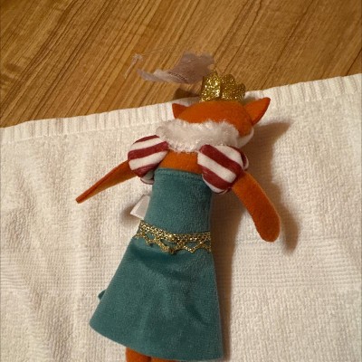 A: The ornament features a fox princess design, complete with a gold-tone crown and glittery shoes.