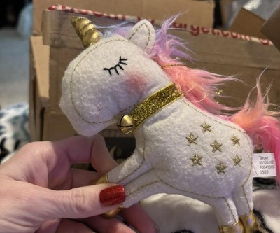 Give this year's tree a magical twist with this 5-Inch Christmas Fabric Unicorn Ornament from Wondershop™. Made from polyester, this hanging ornament is designed as a white unicorn with a gleaming gold-tone horn and hooves, a pink tail and vibrant mane in lemon yellow and pink. Plus, it also sports a gold-tone collar with a jingle bell for added flair. Equipped with a top string loop, it's easy to hang from the branches of your tree.