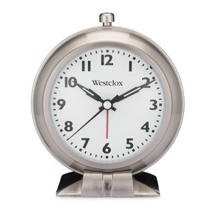 Westclox classic loud bell alarm clock is made of premium metal with a beautiful nickel finish and features a dome glass lens. The quiet sweep movement is smooth so you won t hear ticking with this clock! Touch the top button to briefly illuminate the clock face. The dial light automatically turns off to conserve battery life and allows you to sleep without the distraction of the light. The loud bell alarm is great for sleepers who prefer a louder alarm. Our quality quartz movement ensures perfect time accuracy. Requires one AA battery to operate. Proudly made by Westclox, Trusted by Americans since 1884.