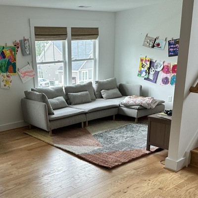 Love the rug. Very shaggy but doesn’t shed and not so long the fibers clump. Colors are more pastel/muted in real life. Very lightweight.