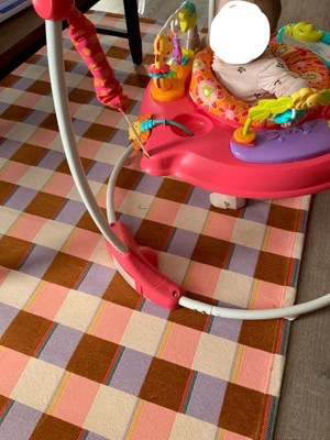 This rug has a fun unique mix of colors. I love plaid printed rugs. I like how the colors contrast while keeping the overall pink theme. It’s perfect for the kids play area. It’s got some good weight to it and is nice and durable. It is low-pile height and the backing is cotton. Rectangle shaped and measures 5’ x 7’. Overall it is very well made and happy with it. Thank you!