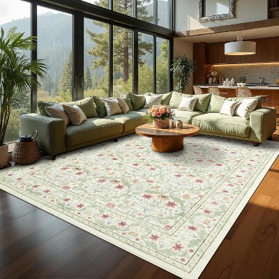 5*7FT Washable Floral Rug, Non-Slip Backing - Stain & Shed Resistant for Living Room, Bedroom, Dining, Office-Black