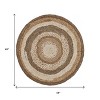 Add some artistry to your room with this 5-foot beige jute abstract geometric hand braided round rug. Crafted from jute fibers that give this piece premium texture, refinement, and appeal. Rugs are a great way to showcase your style, hide imperfections, warm your home and reduce noise. This smaller sized, transitional styled rug is just what you need for your walkway, bedside, in front of door, cabinet, refrigerator, or chair. 48.00-inch h x 48.00-inch w x 0.50-inch d.