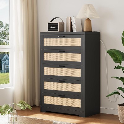 5 Drawer Rattan Dresser for Bedroom, 47.27” Tall Dresser with Power Outlets