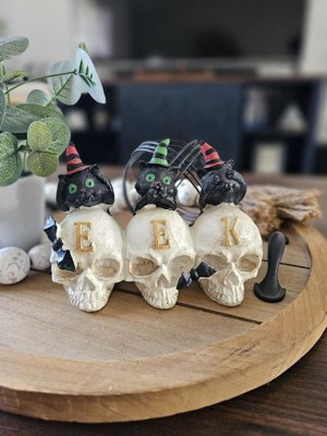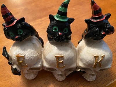 The 5in. EEK Skulls with gold lettering is a fun and quirky Halloween decoration that combines classic spooky elements with a playful twist. This piece features three black cats in striped witches' hats, each striking a classic "hear no evil, speak no evil, see no evil" pose, adding both humor and charm to your Halloween decor.