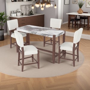 - BAR HEIGHT 5-PIECE DINING SET: Includes a sleek faux marble dining table and four linen-upholstered chairs. Features mid-century modern style with minimalist design and sturdy construction—perfect as an accent piece for any home.