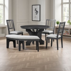 - MODERN RUSTIC ELEGANCE: This round dining set blends modern design with rustic charm. The smooth, curved table base serves as a striking focal point, while the wood finish adds warmth to your space. Slat-back chairs and a gracefully arched bench—both with soft upholstered seats—complement the table’s minimalist style. Perfect for contemporary or farmhouse interiors, it balances form and function for an inviting, stylish dining experience.