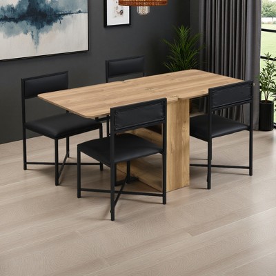 Upgrade your dining area with this 5-piece extendable dining table set, thoughtfully designed for modern homes and compact living environments. The centerpiece of the set is a versatile table that expands from 31.5 inches to 63 inches, making it easy to transition from intimate meals to larger gatherings with friends or family. Its space-saving design is ideal for apartments, studio units, or cozy dining rooms where flexibility and functionality are essential.The set includes four stylish dining chairs, each upholstered in soft, easy-to-clean PU leather that combines elegance with everyday practicality. The cushioned back and seat provide exceptional comfort for extended dining sessions, while a sturdy stretcher under each chair adds extra reinforcement, ensuring stability and long-lasting use.Suitable for various décor styles, this dining set is available in two modern color options, allowing you to coordinate with your existing interior whether your taste leans more contemporary or classic. The compact, foldable design of the table makes it a perfect fit for smaller spaces, giving you the flexibility to easily expand your dining area when needed and save space when not in use.With dimensions of 31.5-63 x 31.5 x 29.7 inches for the table and 18.1 x 18.3 x 32.3 inches for each chair, this set is built for both comfort and durability. Each chair can support up to 330 lbs, and the table holds up to 220 lbs, making this a safe and sturdy choice for your household. Easy to care for and designed to meet a variety of needs, this extendable dining table set delivers modern style, space efficiency, and dependable quality all in one package.