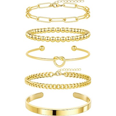 5 Piece Gold Bracelet Stack Set for Women with Bangle Cuff Paperclip and Chain Bracelets, Non Tarnish