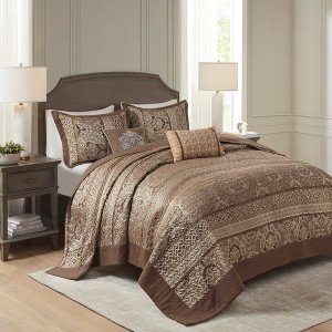 The Madison Park Bellagio 5 Piece Reversible Jacquard Bedspread Set offers a luxurious update to your bedroom decor. Made from quilted polyester jacquard, the brown/Gold coverlet and shams share leaf, woven striping, and ironwork motifs that are accentuated by elegant stitching. Flashes of gold are used throughout this collection adding a lavish feeling to your decor. Two decorative pillows feature embroidered details that correspond back to the coverlet to complete the stately ensemble. Machine washable for easy care, this jacquard bedspread brings an extravagant and traditional touch to your bedroom.
