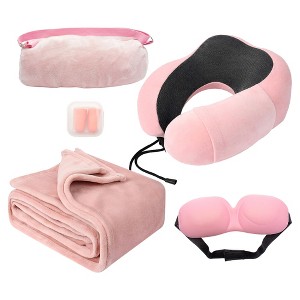 - All-in-One Travel Comfort Kit – Includes a neck pillow, fleece blanket, 3D eye mask, earplugs, and matching blanket bag for easy storage.