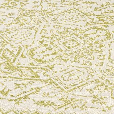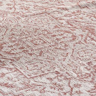 This rug was not only very decently priced compared to so many indoor/outdoor rugs but it is so pretty and I can see so many uses for this rug. The dark red is beautiful and the light beige almost silvery looking background makes this a great accent for almost any space!