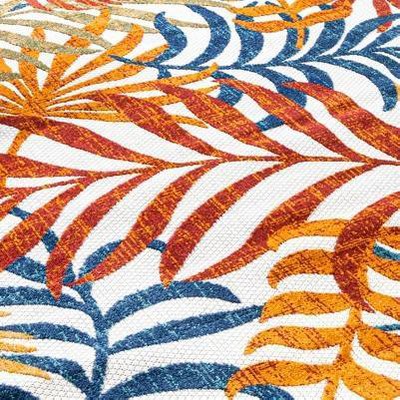 Whether you live in a tropical beach retreat or just love jungalow style, the allover palm frond pattern of this rug brings the jungle home. Overlapping palm tree branches create a rich pattern of navy, aqua and khaki tones. The pet-friendly and kid-proof flatweave design makes it easy to clean.