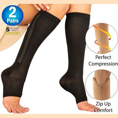 - EASY TO WEAR OPEN TOE ZIPPERED DESIGN : Pressure support stockings feature an innovative side zippered design that makes them easy to put on and take off, compared to traditional compression socks. Experience maximum comfort with the open toe design, which eliminates the pressure on your toes and helps prevent blisters and other foot related issues. The Open toe compression sock design makes provides an ideal fit and comfortable for all-day use.