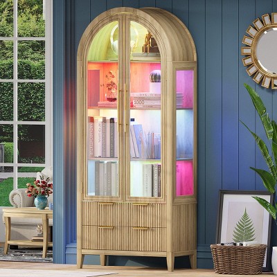 5-Tier Arched Pantry Storage Cabinet, Farmhouse Display Adjustable Shelf with 2 Glass Doors, Cupboard for Kitchen Dining Room Living Room, Brown