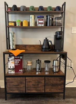 I bought this rack to use as a coffee and tea station, and it’s been perfect. It has plenty of storage space, so everything from mugs to tea boxes and coffee accessories has a place. The drawers are a nice touch—they look like wood in the front, but they’re actually soft cloth with a sturdy bottom, so they hold a surprising amount without feeling flimsy. The surface is just the right size for my coffee maker and kettle, and it feels stable when in use. Assembly was straightforward, and the rack feels solid once put together. Overall, it’s definitely a great buy if you’re looking for extra storage or a dedicated coffee/tea station.