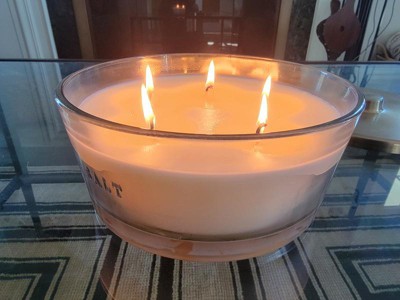 Scent is not easy to review as it affects everyone differently. But in my opinion... I love this candle so much... I need to stock up on them... lol... a beautifully perfect soft light clean lemon breezy scent with top notes of lemon with a soft musk. Absolutely a perfect Spring-Summer seasonal candle. Not very strong, and as it burns waves of a beautiful sunrise and sunset come to mind with the scent that comes off this candle. It is long lasting. The candle is a 5-wick burner. Gives off a beautiful ambient glow. The glass container is thick and reusable. It is topped with a gorgeous brushed light bronze color that closes securely. SALT. Perfect. Just what I needed and better than expected.