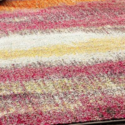 Broad strokes of color inspire this painterly rug. Bold design with a tranquil effect, the super soft polypropylene is power loomed for the tightest possible weave, making the design look even more stunning in person. In shades of pink, fuchsia, coral, yellow, beige and gray it has a mnge of hues that would suit many design styles.