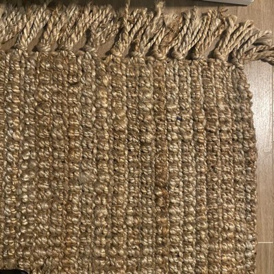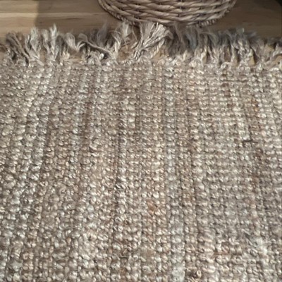 Very pleased with this Jute rug! Started out with the 5x8 size but downsized to this 4x6 natural color because it fit my space better. The braided jute of course comes a bit nubbly feeling at first but I’ve had it for a month and the feeling softens up a bit! The fringe detail is lovely. Holds up well in a high traffic area and even my robot vacuum can climb over it and doesn’t damage the material. The color is perfect, a natural blend of different shades of tan just as you’d expect. Exactly as pictured!