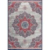 - Combining tones of gray, pink, red, and blue, this rug is a versatile addition to any color scheme