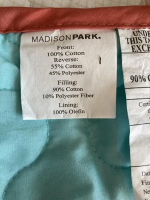 I purchased this because I wanted a 100% cotton, breathable blanket. It was advertised as 100% cotton, that even appears on the packaging. It is not! While the top of the quilt is 100% cotton the back is a 60/40 blend with polyester and the batting is 10% polyester. I had to return it on principle and write this review. If you are concerned about the use of petrochemical based fabrics because they cause micro plastic pollution then this is not the blanket for you. It seems ironic that a product that has a marine design would use fabrics and batting that are negatively impacting that marine environment and, in turn, the climate of our planet. The design, colors and quality of the product seem good although it was very stiff and would probably require several micro plastic shedding washings to soften up. Too much sizing maybe???