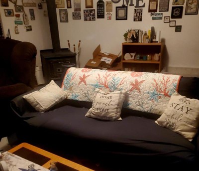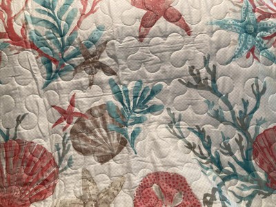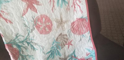 [This review was collected as part of a promotion.] This oversized throw is so nice. Its roomy 50X70 inch and is a nice addition to any room. The throw is made of cotton, which I love It can be machined washed cold and dry low so its durable. The quilt is made very well and sewn nicely even down to the corners. The quilt adds lots of color and is reversible to an aqua color. The coral, starfish, seashells and sea plants look welcoming, especially on a cool summer night, just to cozy up in. The quilted throw is so soft and supple without being too heavy while adding warmth. I like this throw for the colors, warmth, the quality and I love the cotton. I highly recommend this quilt and plan on using this for a very long time.