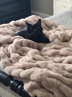 • A: The blanket features a plush faux-fur construction with ruched detailing for added texture.