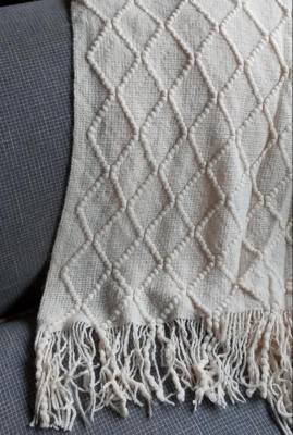 [This review was collected as part of a promotion.] Super soft airy throw. 100% acrylic but feel like cotton. The diamond pattern in classic and beautiful. Kind of looks like hand crocheted. Not something that would keep you warm in the winter, but definitely right for a cool summer night.
