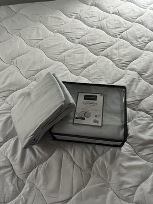 [This review was collected as part of a promotion.] A really nice “true white”. Super soft sheets with great quality cotton! I can already tell that this is comfy and will fit great on my king bed! Thick enough to be warm & high quality but not too thick where you sweat at night. Love this!