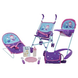 Mermaid 9 pcs Stroll, Feed n Play Set is a perfect role play set which includes a doll stroller, highchair, a bouncer, a matching handbag / diaper bag and feeding accessories for little parents to play with their favorite dolls and plush characters. The stroller folds easy for storage or travel, safety harness and double front wheels. As well as a doll highchair with a front feeding tray along with feeding accessories, a bouncer for relaxing and snoozing, matching diaper bag / handbag and feeding accessories. This all-in-one care set will provide tons of fun and fantasy play for little parents! For doll up to 16"(41 cm). **Doll not included**.