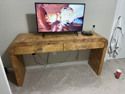 Add a touch of sophistication to your home with this Modern Console Table with Burl Wood Veneer. Featuring a stunning burl wood veneer finish, this table showcases the natural beauty of wood grain patterns, adding warmth and texture to any space. Its slim design is perfect for entryways, foyers, living rooms, or behind sofas, serving as a stylish platform for decor, keys, or other essentials. Crafted with durable materials, it offers long-lasting stability while maintaining a sleek and modern aesthetic. The minimalist silhouette makes it versatile, blending seamlessly with contemporary, mid-century, or transitional interiors. Whether as a functional entryway table or an eye-catching statement piece, this console table elevates your home with elegance and practicality.