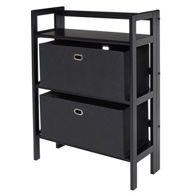 I took pictures but can't upload them to this site?!! Anyway, I love this bookshelf. I didn't buy it because it folded up, but because I liked the look and thought it might be easier to put together than the other Winsome 55" book shelf I tried. It is a fairly easy assembly...the top shelf took a bit of work, but the rest of the unit went together easily. If you are buying it because it folds, just know that the top shelf would have to be remmoved before folding it - that was the shelf that didn't go in easily! It is black and there were a few blemishes on the top shelf which I fixed with Old English black polishing liquid. The sides are real wood, and the shelves are not, but I think the whole unit looks like real wood. I'm very happy with this purhase. Wish I could show you the pictures!!