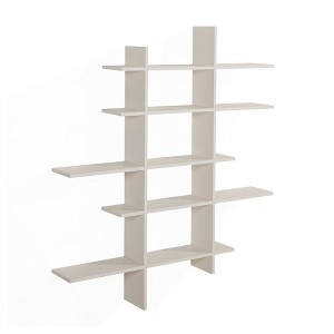 Bring your walls to life with the Danya B. Five Level Asymmetric Shelf in White. This wall-mount decorative shelf is as easy to install as it is sturdy, able to support multiple items across its more than 10 shelf surfaces. It's the perfect depth to hold books and collectibles. This floating shelving unit will quickly become one of the top favorite features of your home as it's unique design is sure to dress up any wall. Minimal assembly required without tools.