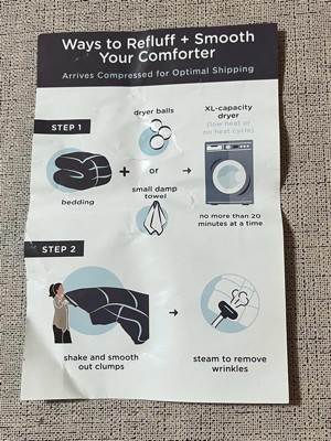[This review was collected as part of a promotion.] Arrives compact; comes with instructions to fluff. After fluffing the comforter is nice and full. The ties get caught on the vacuum, however, so be careful.