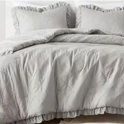 [This review was collected as part of a promotion.] I recently received the Hannah 3-Piece Gray Full/Queen Diamond Quilted Ruffle Edge Comforter Set in exchange for my honest feedback, and I couldn't be happier with it. The comforter's top-quilted diamond patterning and ruffled edges add a touch of elegance to my bedroom, and the versatile gray color fits perfectly with my decor. The weightier touch of the fabric provides an extra silky feel that makes it incredibly luxurious. One of the first things I noticed was how fluffy and comfortable the midweight polyester filling is. It provides just the right amount of warmth without being too heavy, making it ideal for snuggling up during long, tiring nights. The smooth solid reverse side adds to the overall comfort, and the cloud-like texture is just what I needed for a good night's sleep. Knowing that it holds an OEKO-Tex certification is a bonus, as it assures me that it's safe and gentle on my skin. The overlapping sham enclosures are a thoughtful design feature that keeps the pillows securely in place, and the entire set is machine washable, making it easy to care for. Even though the items arrived in compressed packaging, they fluffed up beautifully after unpacking. Overall, this comforter set has significantly improved my bedroom's comfort and style, and I highly recommend it.