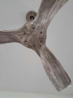 - Brushed nickel finish motor. Three gray finish faux wood fan blades.