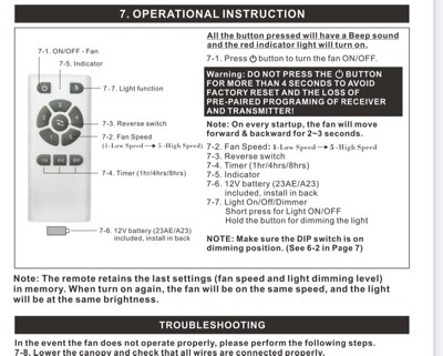 Beautiful fan. I like the small 6" canopy. I need to tell you that the fan beeps every time you use the remote. There is no way to turn it off. I wish I had known this. I might not have purchased it. I should have read the documentation more carefully. The fan doesn't remember its last setting with an on/off wall switch. But it's a nice looking fan, well packaged, sent quickly.