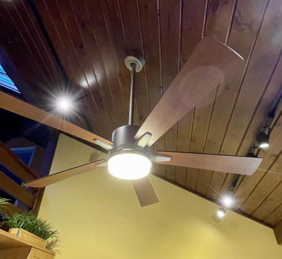 [This review was collected as part of a promotion.] This is a sleek and elegant ceiling fan that brought a contemporary design to my kitchen, which replaced an outdated pull-chain ceiling fan. I couldn't be more happy with the finish, as the brushed nickel body perfectly matches my kitchen appliances and the walnut colored fan blades match my wood ceiling slats. It's like Kichler designed this fan for me, although those without walnut stained ceiling slats don't fret...the fan blades are reversible so you can choose to have the silver colored side face-down should you choose. The motor is whisper-quiet, and I have to literally have to look at the fan after hitting the switches' off button to make sure it actually turned off. Although the wall switch is very basic and does not contain a motor reverse button, there is a switch on the motor housing itself if you want to reverse the fan direction during the Winter months to better circulate the heat. The LED light unit also gives off an amazing amount of light, which I'd say is probably about 3000k in color temperature. The wall switch, as I just mentioned, is basic, although I prefer having separate buttons for the 3 fans speeds unlike the wall switch they use for their higher-end models. The light button will glow in the dark if it gets enough light "charging" it, and the light button also acts as a dimmer switch if you press and hold it. Of course what I like most about the wall switch is that it's completely wireless. Although my ceiling fan was already wired to have a hard-wired wall switch, this is an amazing solution for someone who is replacing an old pull-chain fan that only had power and no pre-existing wall wiring. Now time to comment more on my review title...What isn't evident with this fan, unless you thoroughly read the instruction manual prior to purchasing, is that it is only recommended for mildly sloped vaulted ceilings of 19 degrees or less. I, myself, did not realize this crucial tidbit until I was installing it. The old Kichler ceiling fan this was replacing was rated for 30 degree vaulted ceilings...that's a big difference. Being that I am an experience DIY'er who was in love with this perfectly styled fan for my kitchen, and was already knee-deep into the install, I wanted to and was able to still make it work despite my ceiling being a bit more sloped than 19 degrees. However, I wanted to make sure others were aware of this limitation PRIOR to purchasing and do not recommend making any modifications to the bracket or canopy. There are safety recommendations for a reason, and any modifications can lead to the fan dislodging. Therefore, this should be a deal-breaker for you if you have vaulted ceilings with any significant pitch. Summing up...if you have a flat or only slightly vaulted ceiling, this is wonderful choice for style, light brightness, functionality and whisper-quietness. It is also perfect for you if you do not already have a hard-wired wall switch since the wall switch is wireless!
