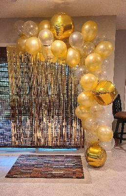 A: Hi Ky - Thank you for the inquiry. Decorate like a pro with the 52ct Large Balloons Arch with Backdrop Gold/Black - Spritz. Following the latest party trend, this set includes illustrated instructions to build out a feature backdrop with a metallic fringe curtain and balloon arch. Hope this helps! - Kris