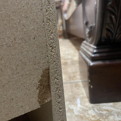 - Detailed with curved top edges, side moldings, a scalloped base panel and solid dark pewter knobs