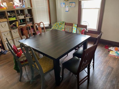 I love everything about this table with one exception. The top, instead of being solid dark brown has streaks of reddish brown. Otherwise it’s perfect. You can easily get 8 chairs around the table when needed. It came packed incredibly well and arrived in perfect condition. Just had to screw the legs on which was easy. It’s a heavy sturdy table, just wish the top were solid brown!