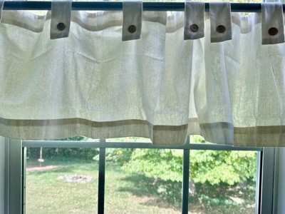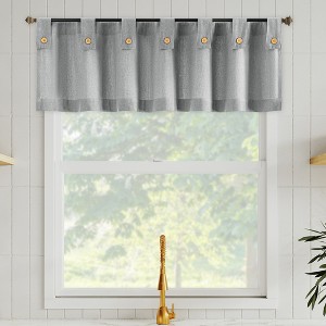 A washed cotton blend fabric embellished with button closure tabs, the Cotton Blend Button Tab Top Cafe Curtain Valance from Archaeo brings next-level design detail to your windows. The natural worn texture semi-sheer fabric gently filters light while enhancing privacy. Ideal for kitchens, bathrooms, or small windows, the tab top design allows for simple slide-through installation on curtain rods up to 0.75” in diameter. Sold as individual valances measuring 54" width by 14" length in color gray. Coordinating tier pairs or swag pairs are sold separately. Measure carefully before selecting your desired size. Rod not included. Machine wash cold on gentle cycle. Use non-chlorine bleach when needed. Line dry, using a cool iron as needed.