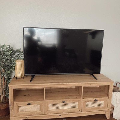 Farmhouse style 55 inch TV stand features wicker door design, and open shelf space in middle with drawers. The cable management cutouts will keep your audio and video cables clean and tidy. Its ranch rustic style would perfectly match your current decor. Elevate your living room as well as your TV set with this beautiful TV stand.