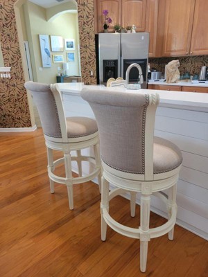 Get a gorgeous upgrade for your kitchen or vanity area with this swivel barstool from the Oliver collection. It features a vintage white finish over a rubberwood frame with elaborate hand-carved details. The cream padded upholstered seat is decorated with a satin nailhead trim, and offers a 180-degree swivel with memory return.