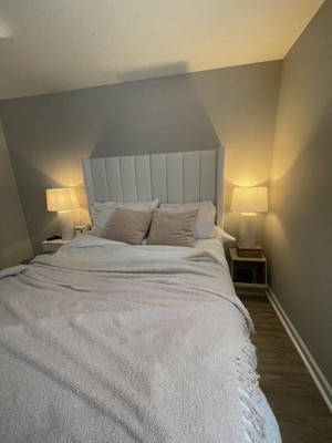 White fabric is taken to the next level with a channel-tufted design on this contemporary headboard from the 55 Downing Street brand. The hanging headboard design is easy to install and pairs with any queen-size mattress or lower bed frame. Attach the headboard to the wall at any height you want to create a custom look for your bedroom decor.