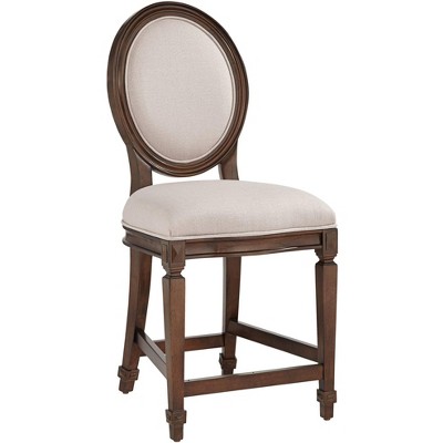 Get stylish seating with this traditional swivel bar stool. It comes in a walnut finish rubberwood frame, with handsome mocha brown top grain leather upholstery. An antique brass nailhead trim decorates the round seat and back, and hand-carved details on the frame add an elevated level of elaborate beauty. A built-in memory 180-degree swivel feature allows the seat to snap back to its original place when not in use.