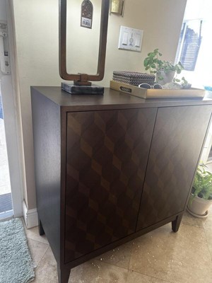 Add this stylish storage chest to your entryway, living room, or bedroom. This transitional two-door accent chest comes in a brown finish wooden frame for a natural, subdued look. The front is decorated with a dimensional geometric graphic pattern and the chest features two shelves.